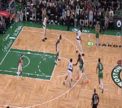 這是塔圖姆這場比賽跟杰倫·布朗的第一次互動,它來的很早,第一節(jié)8分28秒。開場的塔圖姆每個球都在找隊(duì)友,不枉我當(dāng)年將他歸類為服務(wù)型核心。這么打暗示了塔圖姆回歸賽場心情激動的同時保持了一份冷靜——傳傳球,熱熱身,慢慢來。我過度解讀一下球員心理,開場幾個傳球回合反映了: